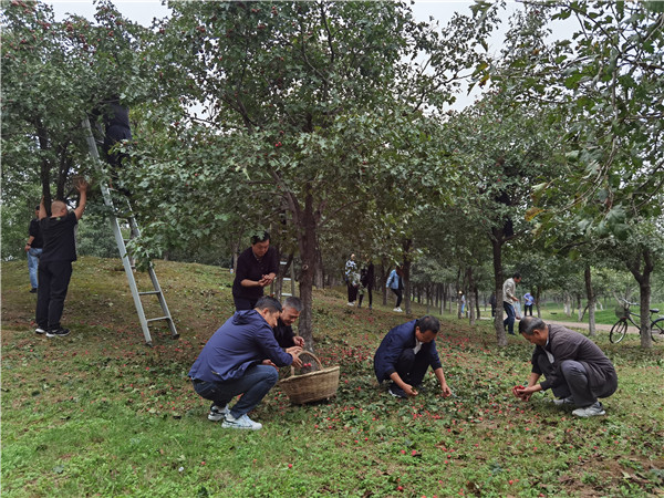 活动开始,各党支部经过简单分工,按照三人一组,五人一群的“黄金组合”,统一领取梯子,篮子,袋子和筐子等工具后便积极投入采摘活动中。山楂树比较高,党员们有的爬上梯子才能采摘,有的树上山楂比较密集,不好采摘,他们就直接用竹竿摇晃树枝,成熟的山楂果就掉进了几人撑着的毯子里,有的把掉在地上的山楂捡到篮子和袋子里,有的把掉在地上的烂果、落果进行清理。在采摘过程中,党员们对果树多余的枝干进行修剪,给果树提供一个良好的生长环境。现场一幅热火朝天的劳动场面,大家撸起袖子加油干,没有一个人怕脏、说苦、喊累,经过大家不停歇的努力,清理出来经济树木林里的山楂和杂果装满了15筐。