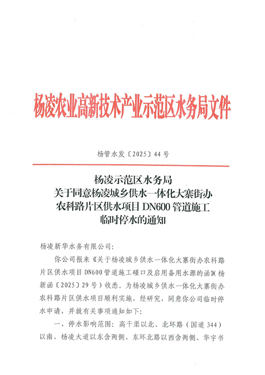 为确保杨凌城乡供水一体化大寨街办农科路片区供水项目顺利完成,保障学校未来研究院用水,经杨凌新华水务公司申请,示范区水务局审批,定于2025年8月29日14:00至8月30日6:00对高干渠路以北区域停水,实施该项目主管道碰口工作。