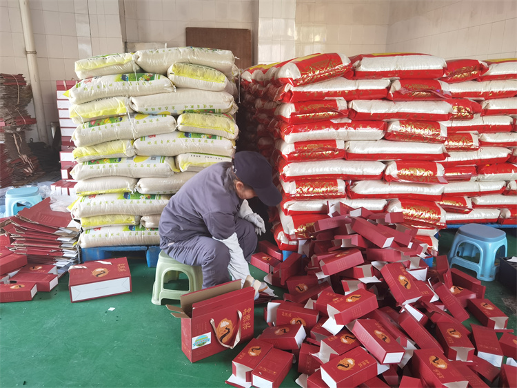 主食加工间工作人员拆盒取米