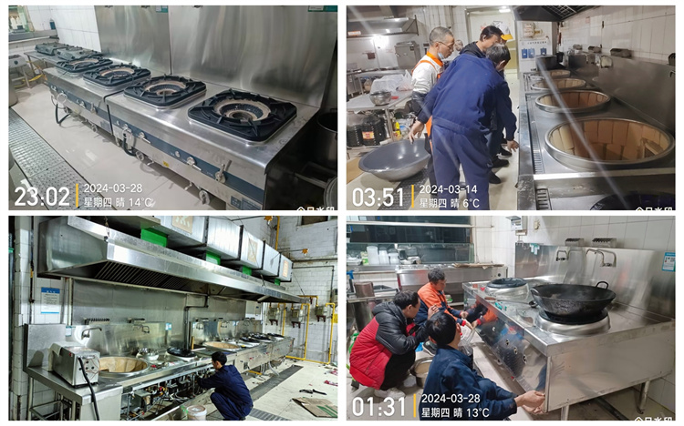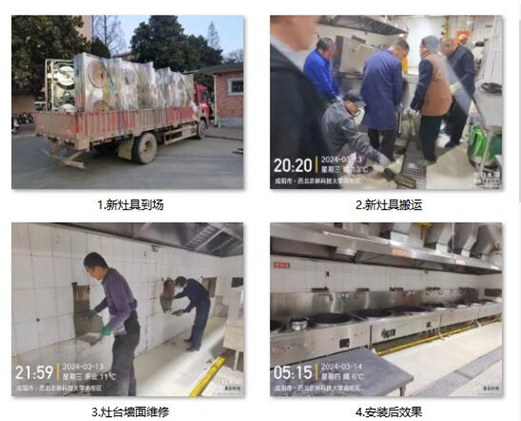 自3月13日开始,至4月3日结束,历时近一个月。在此期间,饮食服务中心高度重视,精心组织,多次召开协调会议,制定了详细的安装方案。工程内容包括旧灶具的拆除、供电供水管道的改造、新灶具的安装调试等。此外,为了确保新灶具的正常运行和维护,对食堂工作人员进行了专门的培训,使他们能够熟练掌握新灶具的操作方法,并在日常使用中能够及时发现并处理简单的问题。施工期间,为了不影响学生的正常供餐,安装工程安排在夜间进行,每晚从9:30开始,至次日凌晨结束。施工人员克服了时间紧、任务重等困难,加班加点,确保了工程的顺利完成。